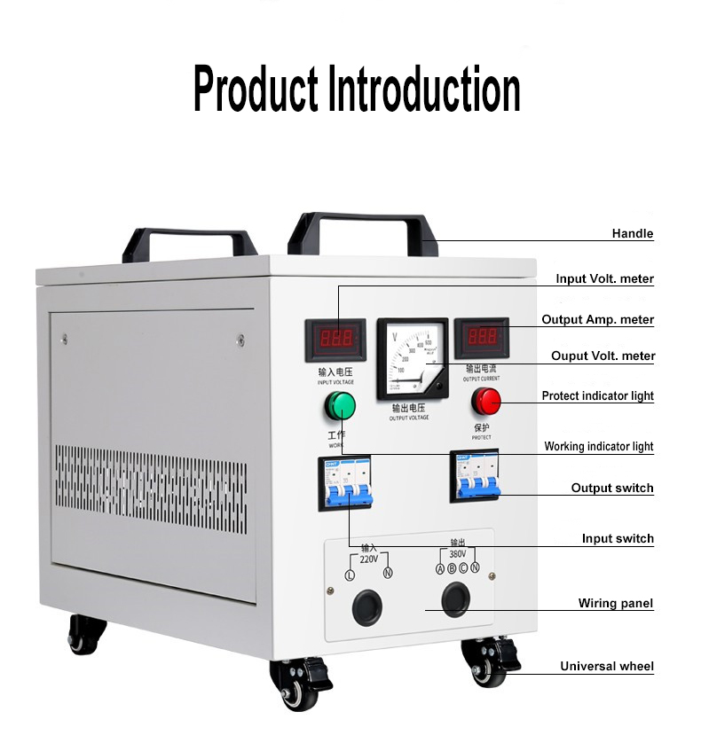 REELEN RSTC series is belong to AC→DC→AC conversion is called single-phase to three-phase power converter, which is different from the variable used for motor speed regulation.Frequency control controller. The main function of the single-phase to three phase power supply is to convert the existing AC grid 220V into three-phase 380V power output with Electric pure sine wave power supply. Inside of Isolation transformer is to increase the stability of the whole machine, with strong load adaptability, good output waveform quality, easy operation and volume Small, light weight and other features, with short circuit, over current, overload, overheating and other protection functions to ensure reliable operation of the power supply.